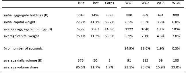 在这些个人投资者中,四个群体的资本权重和数量份额相对平衡。然而,就账户数量而言,拥有最微薄财富的群体是所有家庭账户的85%,而顶层的0.5%富人们则支配着巨额资产。