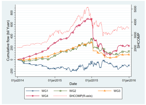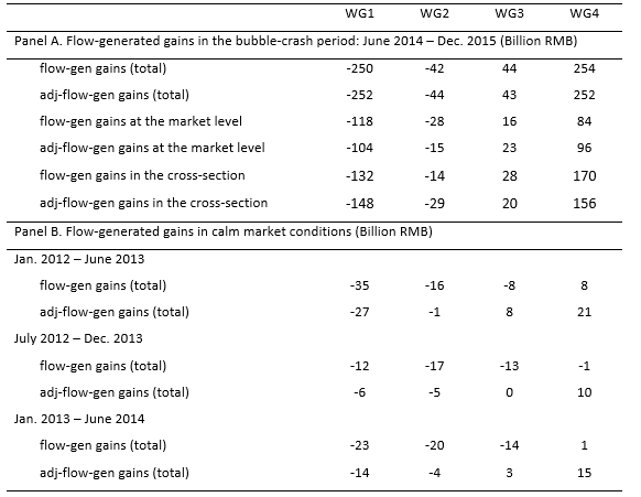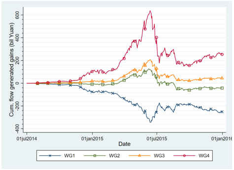 接下来,我们为不同的财富组计算流量及交易产生的收益和损失,如图2,以相同初始持有量的买入持有投资者作为基准。从2014年7月到2015年12月,收入最低的85%的投资者损失超过2500亿人民币,而在这18个月期间,收入最高的0.5%的家庭却获得高达2540亿回报。