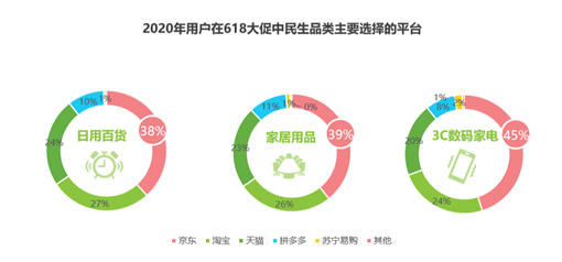 民生用品成为疫情大促中用户最关心的品类。以日用百货、家居用品、3C数码家电为例,B2C平台中,选择京东的用户占比较天猫高14-25个百分点;在3C数码家电品类中,选择京东的用户占比比天猫与淘宝之和还要多1个百分点。