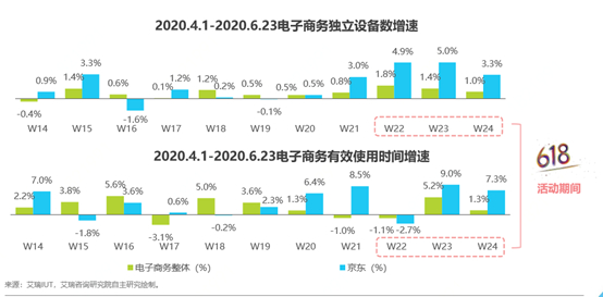 艾瑞UserTracker监测显示,从疫情期间到618期间,电子商务独立设备数与用户有效时间的增速呈现出由慢至快的过程,在618前后出现了增长高峰,体现出618大促对疫后消费的带动作用。其中,在疫情期间表现优异的京东,持续处于行业领跑者的角色,增速明显高于电子商务整体大盘。