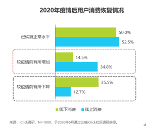 疫情期间,用户对消费的态度由起初的恐慌忙乱,逐渐变为从容理性。这其中线上消费渠道发挥了重要作用。在线上消费的有序支撑下,用户快速恢复了消费信心,超过50%的用户线上线下的消费都已经恢复正常。而35%的用户表示,疫情发生后,其线上消费行为大幅增长,与此相对的是35.5%的用户表示其线下消费较疫情前有所下降。