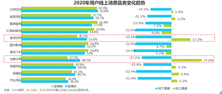 对比疫情前后,用户对线上消费的使用明显增加。用户增量最高的生鲜水果与食品饮料品类,疫情后用户线上消费比疫情前增长了27.6%与17.3%。保健品、汽车用品、母婴用品、家居用品及日用百货的线上消费比疫情前有明显增长。