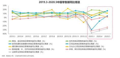 受疫情影响,多种商品的零售额出现剧烈波动。服装纺织、体育娱乐与金银珠宝等品类下滑明显,受影响较小的有食品粮油及饮料类商品,家电、通讯、日用品出现短暂下滑后在4月起明显回暖。