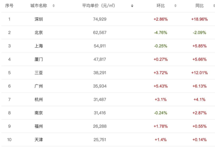 根据国家统计局数据,今年3-5月深圳二手房价格环比涨幅分别为1.6%、1.7%、1.6%,在全国70个大中城市分别排名第1、第2、第2;同比涨幅分别为9.7%、10.3%、12.0%,在全国70个大中城市分别排名第5、第3、第2。