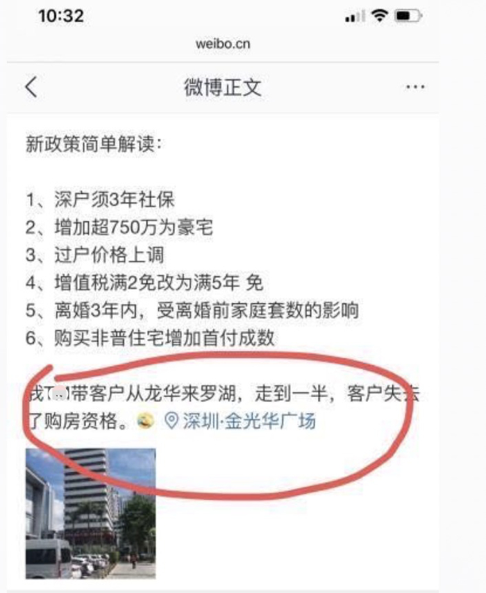 新政在今天上午宣布后,有地产中介在网上表示:“我带客户从龙华来罗湖,走到一半,客户失去了购房资格。”