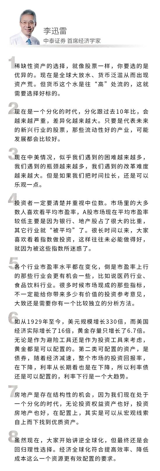 李迅雷 确实有好多粉丝问我,这些文章是不是你自己写的,你微博上面的这段话是不是你写的?其实确实都是我写的。我觉得做投资对我来讲,充满了不确定性,驾驭投资有一定的难度,因此,我还是喜欢做研究。研究宏观往往是自上而下,而上面有很多不确定性。一会儿中美贸易摩擦加剧了,一会儿又是发生地震了,这些我觉得都会对我们的资本市场带来影响,但究竟是怎么样的影响,这里面的逻辑链很长,不确定更多,所以我基本上就没怎么去研究资产价格如何波动,那剩下的时间就是研究确定性的东西了。从时间安排来讲,我每天晚上在睡着之前,我都是在思考各类社会的、经济的问题,思考中就睡着了的。因为我总是想着我接下来大概要写一篇什么东西,那我就在睡觉的时候多想想。在飞机上我基本也是在写东西的。当然,高强度的脑力劳动,要维持一个比较好的体力,这就要经常保持运动。