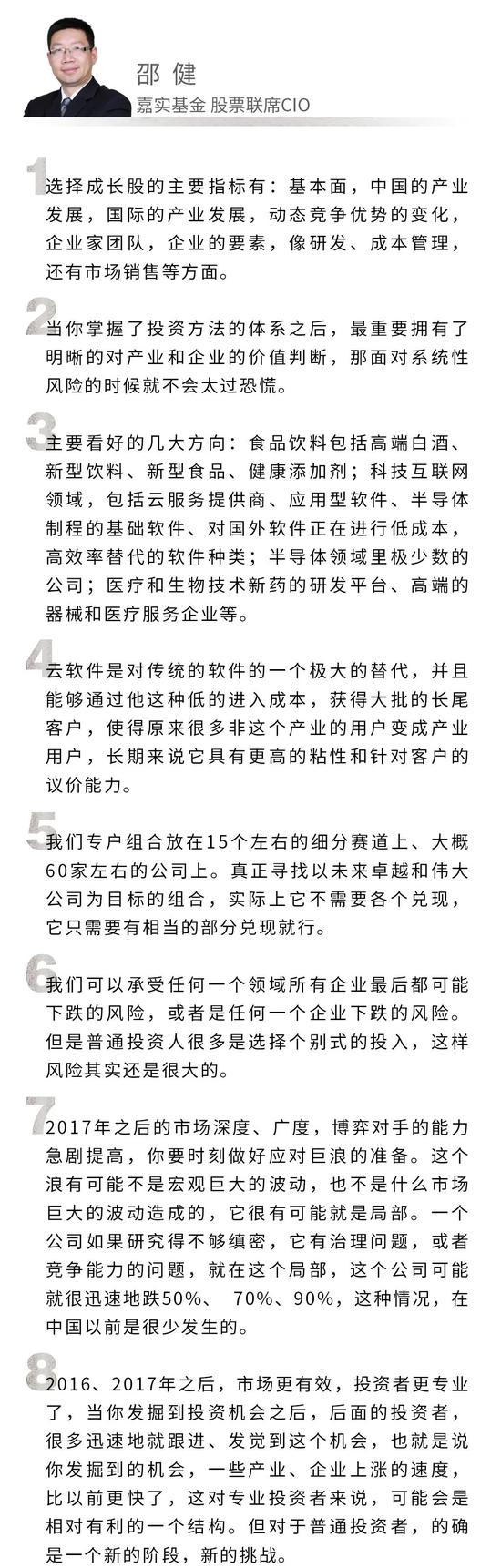 首先我觉得理念上很重要,您刚才提到中国的整个经济的增速在2010年之后是下行的,所以在这样一个下行的经济体里边,大家可能会觉得找伟大的公司比较难,有这种畏难情绪,我觉得畏难情绪本身可能就是第一个需要克服的挑战。