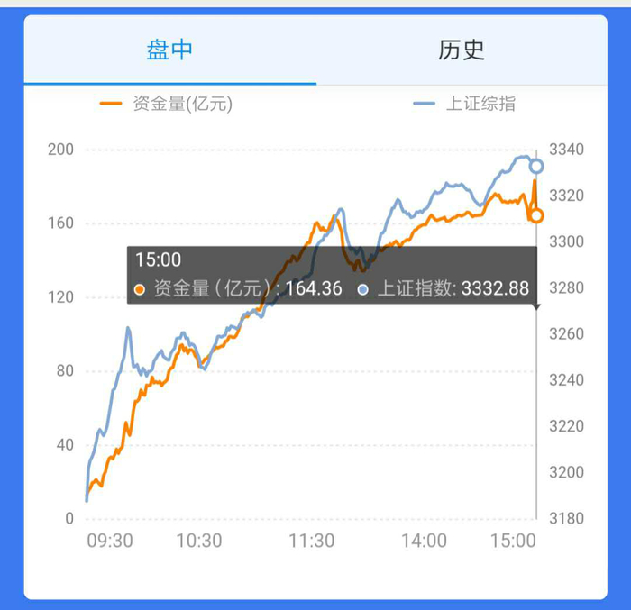 点击【盘中】按钮,可以看到当天外资流入和流出的数据;点击【历史】按钮,可以查看过去一段时间的历史数据,有四个时间周期,分别为季度、月度、每周、每日。