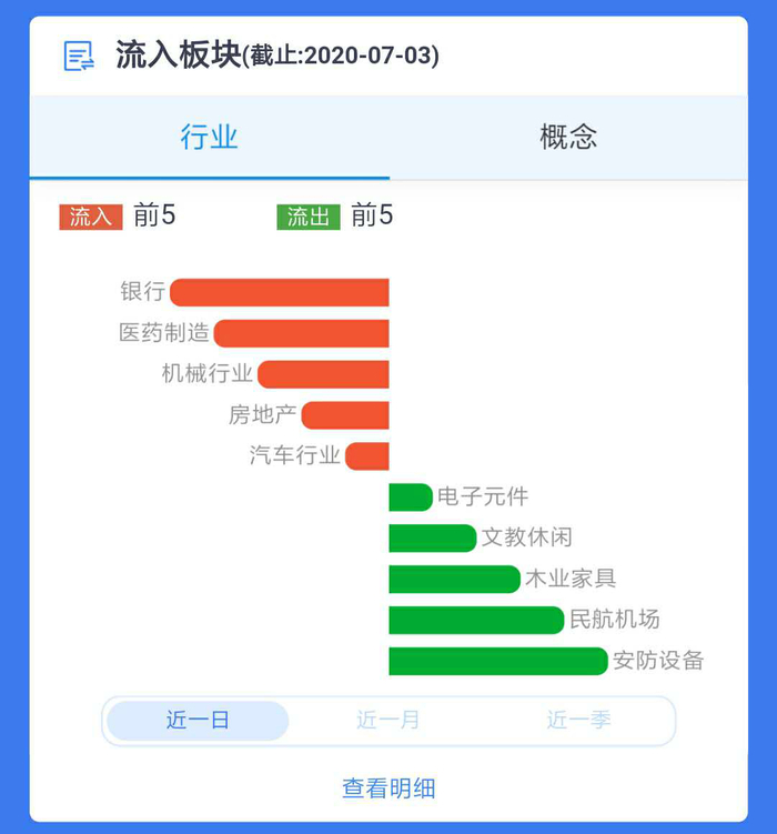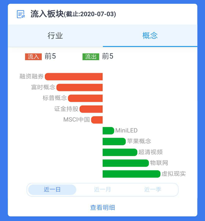 点击【行业】按钮,可以查询外资流入最多和流出最多的前5个行业,点击不同的周期,可以看一段时间的数据;点击【概念】按钮,可以查询外资流入最多和流出最多的前5个概念板块,点击不同的周期,也可以查看与其对应的历史数据。