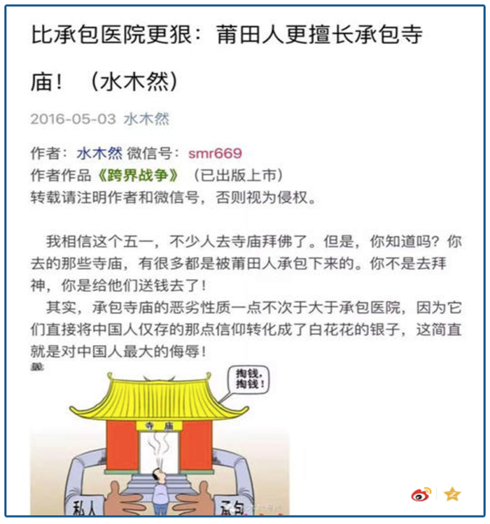 要想改变坏形象确实非常困难,一个例子是2016年,有篇文章传播很广,名字叫《比承包医院更黑:莆田人承包了中国90%的寺庙》,几千个各类媒体纷纷转发,口水又把莆田系给淹了。