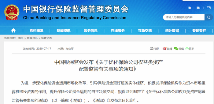 中国银保监会发布《关于优化保险公司权益类资产配置监管有关事项的通知》