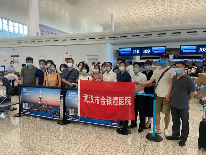 武汉市金银潭医院医疗队登机前合影。