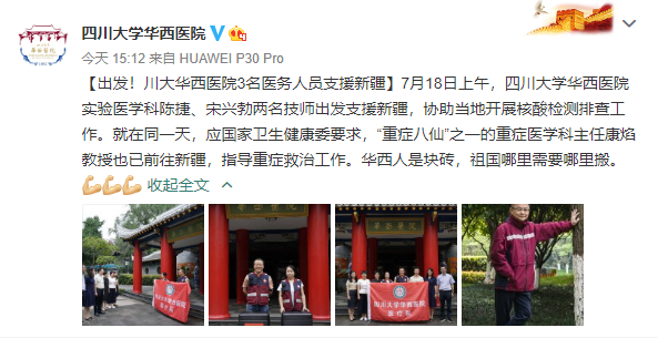 就在同一天,应国家卫生健康委要求,“重症八仙”之一的四川大学华西医院重症医学科主任康焰教授也已前往新疆,指导重症救治工作。这是康焰继驰援武汉、黑龙江绥芬河抗击疫情后,第三次“应征出发”。