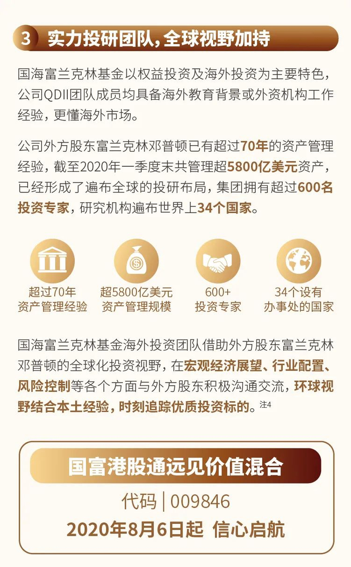 那么童鞋们如何把握当下的布局时机呢?富博士建议大家通过港股通基金,间接投资香港市场,一方面,港股通标的已经包含了香港市场多数的优质股票,另一方面,由专业基金经理操盘,也刚好解决了普通投资者对港股陌生、不懂投资的困境。富博士家即将发行的这只港股通基金——国富港股通远见价值混合(009846),就是不错的选择: