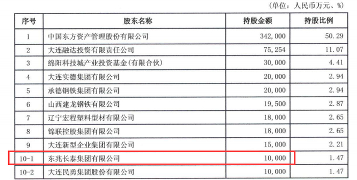 根据大连银行发布的2020年第一季度报告显示,东兆长泰集团持有大连银行1亿元股票,并列第十大股东,持股比例1.47%。