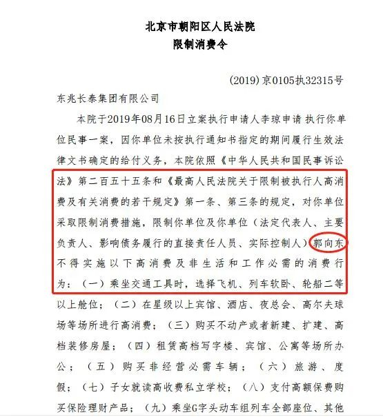 2019年8月开始,北京、成都两个城市先后分别对郭向东及其领导的下的多家公司作出了限制消费令的判决。