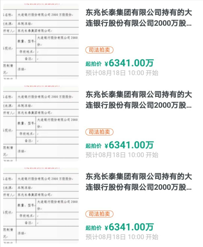 7月21日,根据阿里司法拍卖网消息,北京市第三中级人民法院(下称北京三中院)将于2020年8月18日10时至2020年8月19日10时止(延时的除外)对东兆长泰集团有限公司(下称东兆长泰)持有的大连银行1亿股股份以起拍价3.17亿元的价格进行公开拍卖。