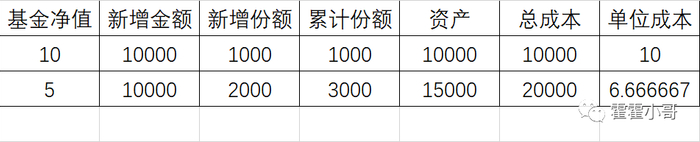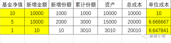 如果这个例子不明显,可以看下相对明显的例子。在10元的时候买入10000元,跌倒5元的时候再买入10000元,成本就可以降到6.67元,而不是7.5元。