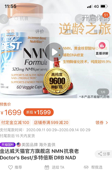 金达威的天猫旗舰店的销售人员在直播中表示,我们给22个小白鼠服用一段时间NMN后,它身体的各项指标和6个月大的小白鼠几乎很接近,可见我们NMN有很好的逆龄作用。