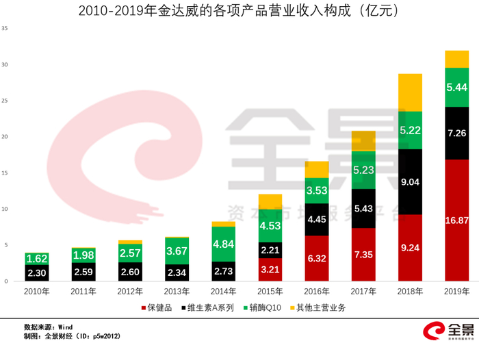 自2015年开始,金达威跨界进入保健品领域,连续斥重金并购,使得保健品业务的发展非常迅猛,于2019年已经超过了维生素A的营收占比,成为公司最主要的营收来源。