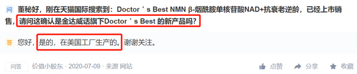 7月9日,深交所互动易的网站上,有投资者与金达威互动,求证了“长寿药”的真实性,金达威的回答也非常肯定。