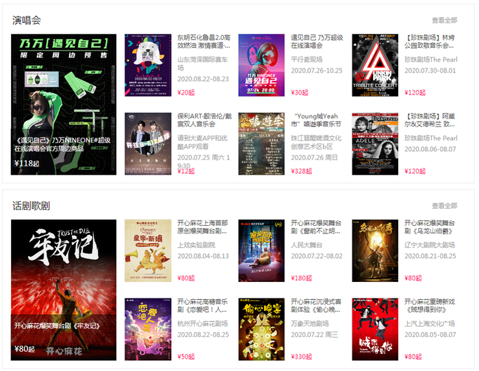 并非依赖电影业务的大麦网、摩天轮等平台的难处则在另一阶段。大麦网首页上主推的是海报音乐节、乃万超级在线演唱会、李智与乐队2020巡演等演唱会;摩天轮则是悬疑音乐剧《Flames火焰》、“六六”喜剧脱口秀、明天的盐《灯和蓝》2020全国巡演等演出;西十区是已经结束的2020梁静茹世界巡回演唱会上海站、话剧《上海屋檐下》。