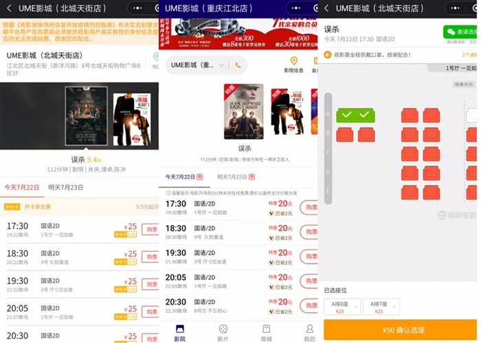 除充值优惠外,目前电影院的影票售价也低于票务平台。锌刻度通过UME重庆江北影城同一场次的《误杀》来对比发现:淘票票售价25元,88VIP会员可立减4元;猫眼电影售价25元,折扣卡22元;UME影城小程序售价22元,充值卡用户可在减2元,即20元购票。