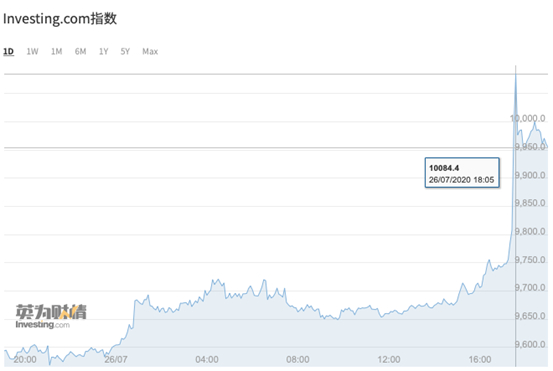 北京时间7月26日午后,比特币兑美元价格快速拉升,直线突破10000美金。截至发稿时,比特币价格回落到9950美元左右。