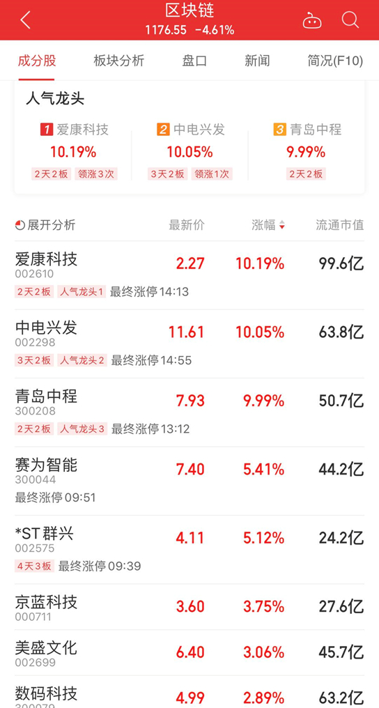 截至7月24日,在区块链概念涨停个股中,爱康科技、青岛中程分别录得2天2板,中电兴发3天2板。