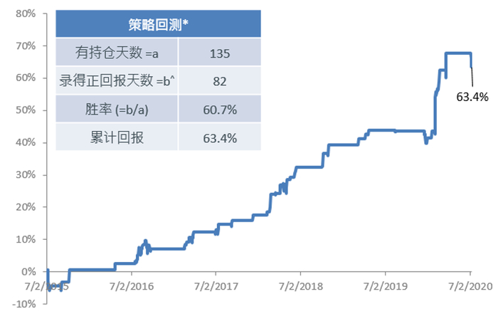 依据以上策略信号进行操作,自2015年1月2日至2020年7月8日,可以获得63.4%的回报。