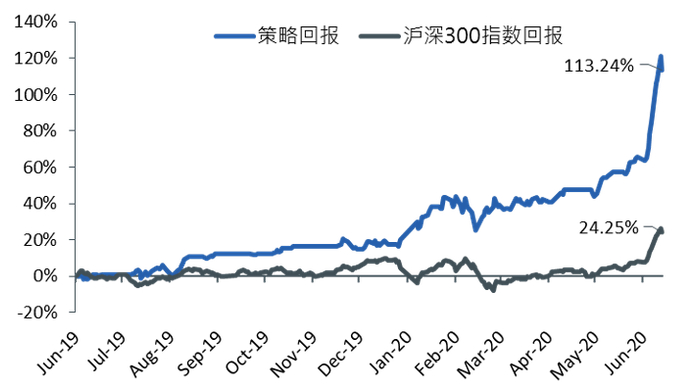 对该策略进行回测,可以发现在2019年6月28日至2020年7月10日期间,该策略可带来的回报是113.24%,交易次数为55次。