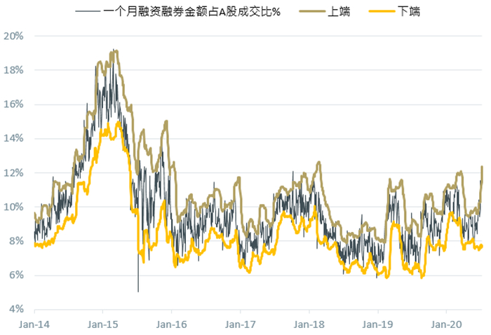 上端:一个月融资融券金额占A股成交% + 2* 该占比的标准差