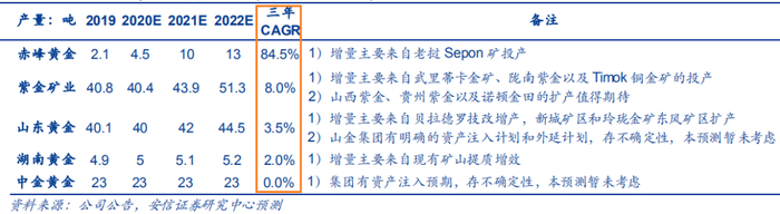 表5 2020-2022年A股黄金公司产量预期(只考虑内生增长)