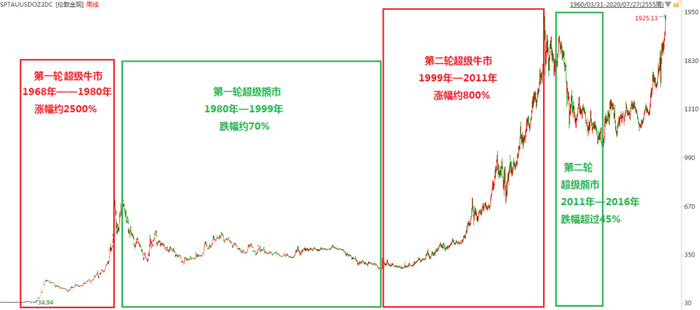 复盘黄金价格历史走势,黄金的牛熊周期时间跨度很长,从1968年至今,黄金大体上出现了2轮完整的超级牛熊周期: