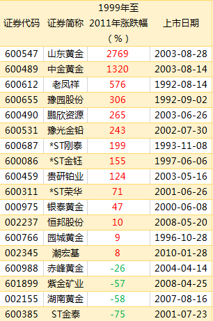 回顾黄金第二轮超级牛市(1999年至2011年),A股黄金股表现强势,其中龙头山东黄金区间累计涨幅超过2768%,涨幅第二的中金黄金区间累计涨幅超过1320%,老凤祥涨超576%,豫园股份涨超306%……