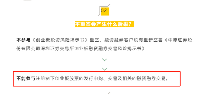 由于注册制下创业板交易涨跌幅等有所变化,对于已经开通创业板的投资者,需要重签风险揭示书,而未开通的投资者开通门槛是10万元资产以及2年投资经验。为参与创业板交易,投资者需尽快重签或开通权限。