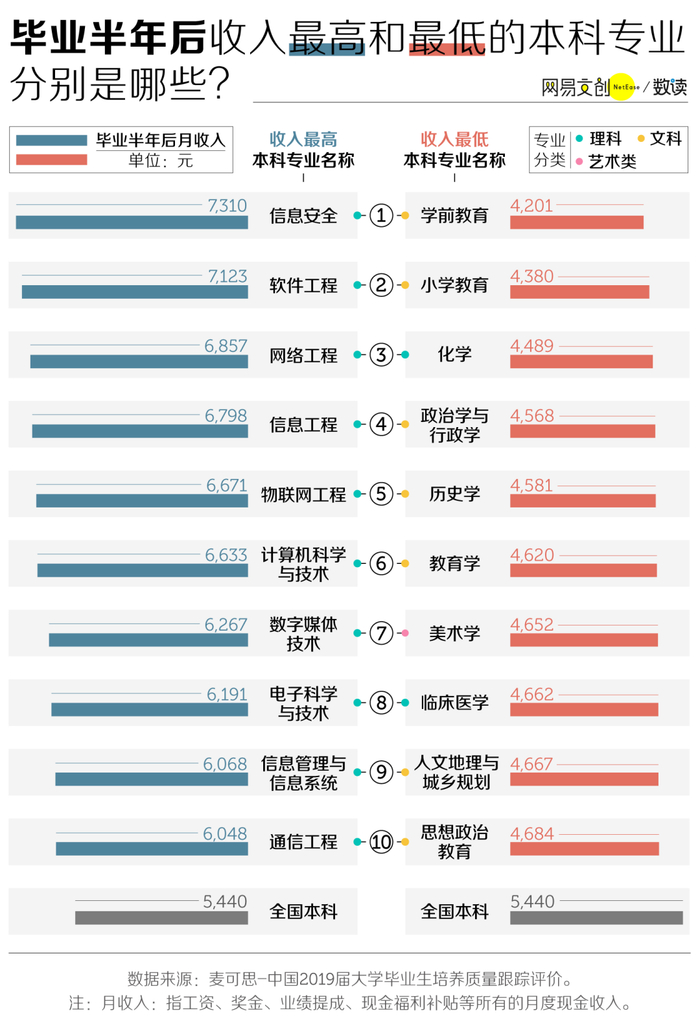 需要注意的是,毕业半年后收入最高的专业都是理科专业,文科生无法填报。相反地,毕业半年后收入最低的前十名专业中有八个都是文科专业。