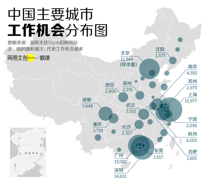 北京、上海、广州、深圳四个一线城市在前程无忧网站上有超过 1 万份的招聘工作,远多于“新一线“城市。“新一线”城市中,杭州、南京、成都等招聘数量均不及上海的一半。