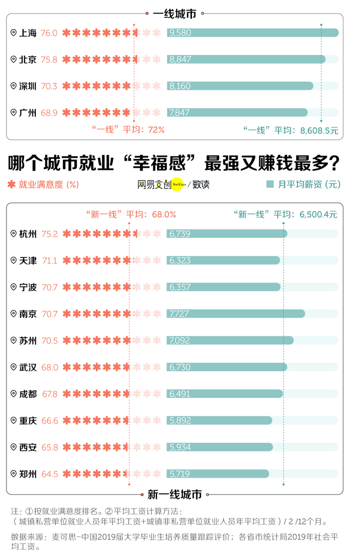 在就业满意度上,一线城市平均就业满意度为 72% ,总体高于“新一线”城市的 68% 。