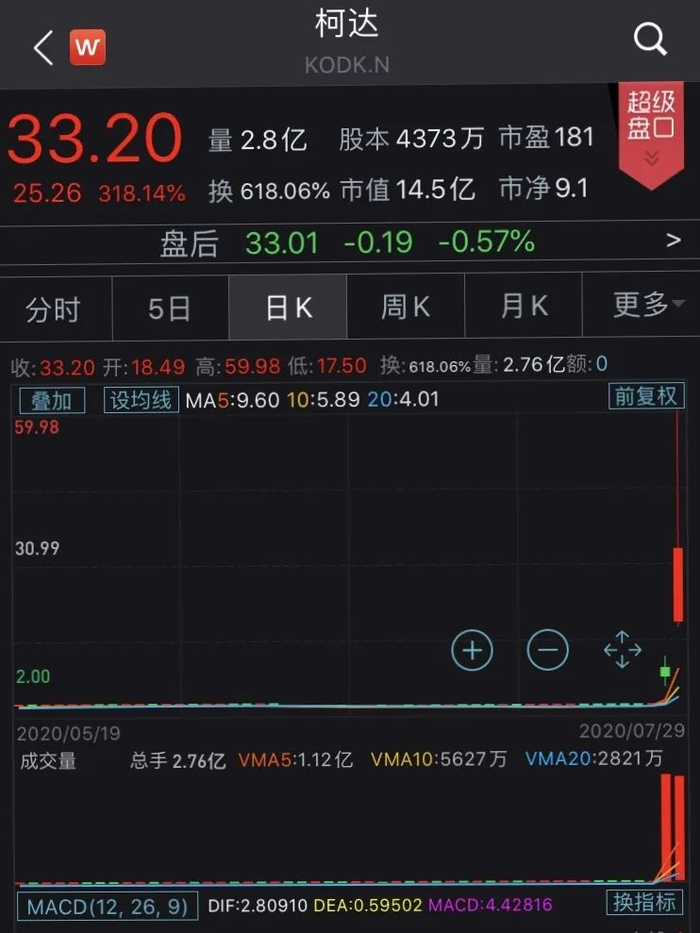 昨夜美股市场上,柯达的股价再度暴涨逾318%,盘中20次触发熔断,一度涨至59.98美元的高点,涨超650%,创7年新高。从7月27日开盘2.13美元到29日收盘33.20美元,3天累计上涨1480%,市值暴增13.6亿美元。