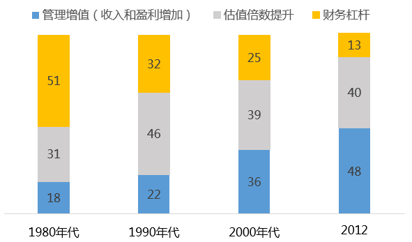 危机对已投项目和企业带来挑战,使投资机构更加注重精细、有效的投后管理,从而提升股权项目的增值回报。金融危机后,无论是对外委托投资还是内部团队直接投资,近年来大型机构投资者对股权投资的投后管理都给予了更多的重视。波士顿咨询公司(BCG)曾在一份报告中分析指出,在上世纪80年代,私募股权交易的高回报主要依靠高杠杆以及倍数套利,管理增值对于回报的贡献占比不到五分之一。但这一比例在过去三十年一直在稳步提升。在后金融危机时代,经营业绩改善占到对整体回报贡献的50%,管理增值已成为了私募股权投资成功的最关键因素。