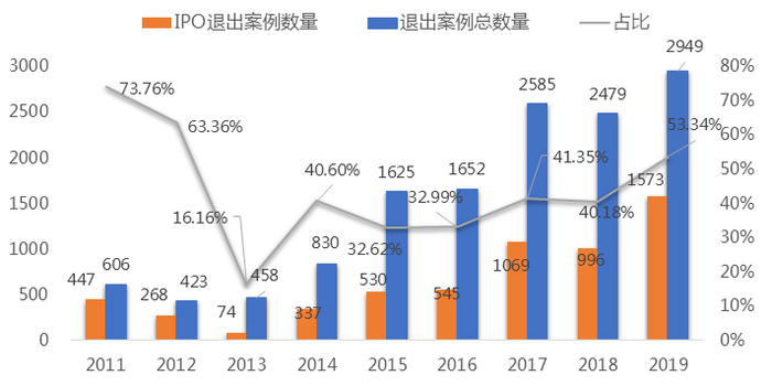 A股市场自2019年科创板推出后,全市场股权融资规模整体回升,股权IPO退出市场空前活跃。2019年中国股权投资IPO退出案例数同比大增58%,在全部退出案例中数量占比过半,带动退出案例总数创历史新高。