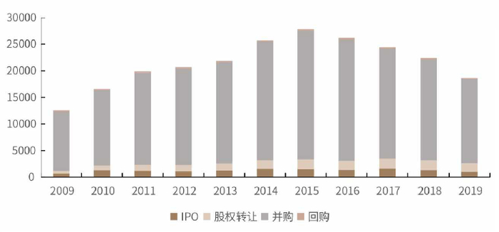 2009年-2019年全球创投基金不同退出方式数量分布