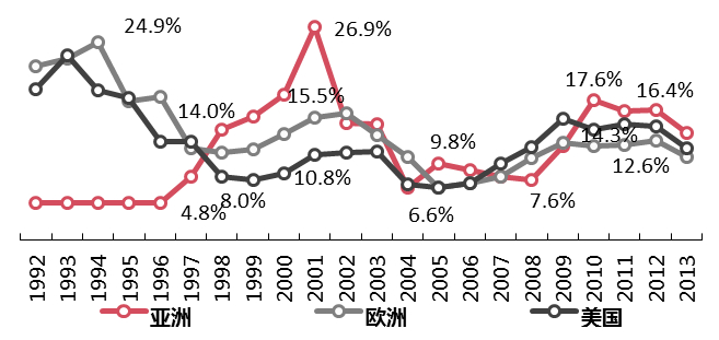 1992-2013年全球股权投资基金收益率趋势图(按地区,IRR中位数)