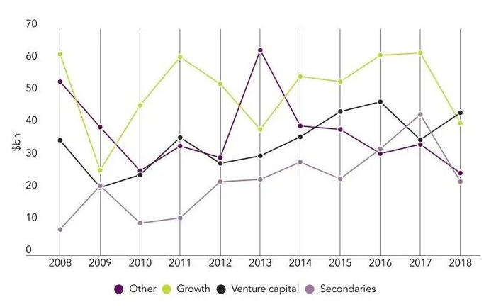 危机后投资者的持币倾向,导致私募股权基金募资额大幅下降。甚至部分LP遭遇财务困境,对于“承诺制”分批出资的基金,面临后续资金难到位的风险。数据显示,2008年-2018年期间,全球不同类型股权投资基金募资额最低点均出现在金融危机之后。