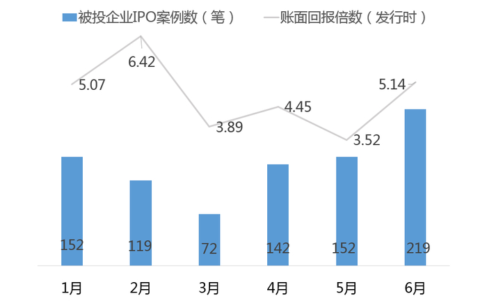 2020H1被投企业IPO案例数及账面回报分布