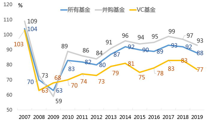 2009年-2019年中国市场股权投资项目退出收益率变化趋势