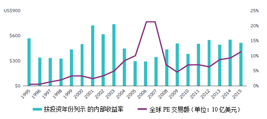 安永在今年6月发布的报告《为什么私募股权基金可以扛住下一轮经济衰退》中,统计了1995年至2015年全球PE市场不同年份的内部收益率数据。可以发现,这期间全球共发生1998-2000年、2008年两次经济危机造成的严重衰退,而每次危机之后PE投资回报率都出现明显上升。