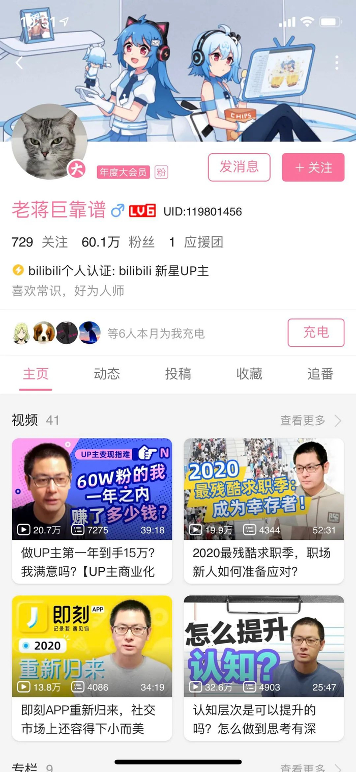 作为一个60万粉丝的UP主,“老蒋巨靠谱”透露自己从去年7月到现在,总共赚了不到15万元。入账主要从后半年开始,从B站官方获得的收入不到3万5,直播收入在4万到5万之间,广告收入了超过5万,还有一部分靠专业度和影响力变现的收入。