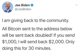 从前副总统拜登到现任大公司负责人均发布了募集比特币捐款的推文。推文称,“我在回馈社区。所有寄往以下地址的比特币将加倍退回!如果你寄1000美元,我就回寄2000美元。只做30分钟。”随后,这些推文附上比特币钱包的相关代码。